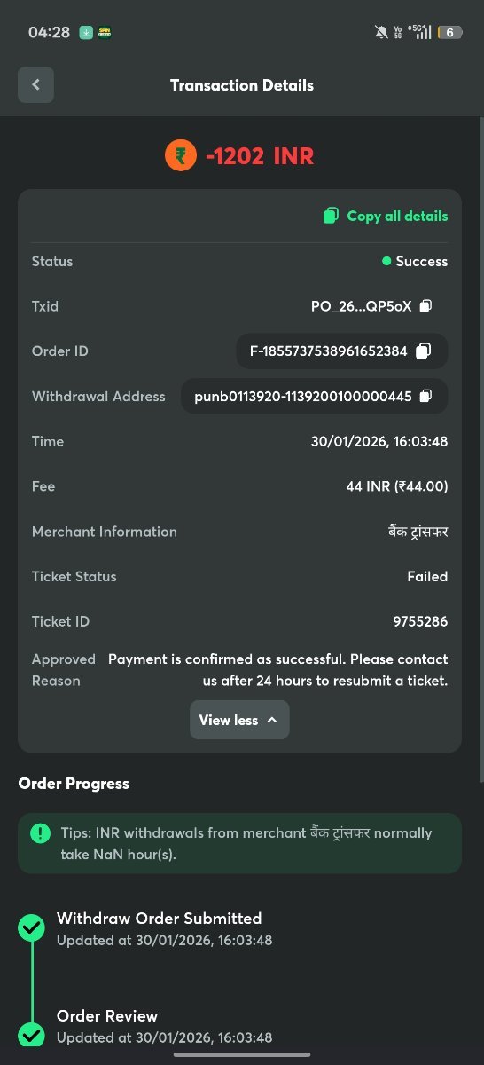 Made a withdrawal on 30th Jan 2026 shows successful but I didn't receive the money .It has been more than a week still ot credited and created a ticket that shows processing. How can I get my money back