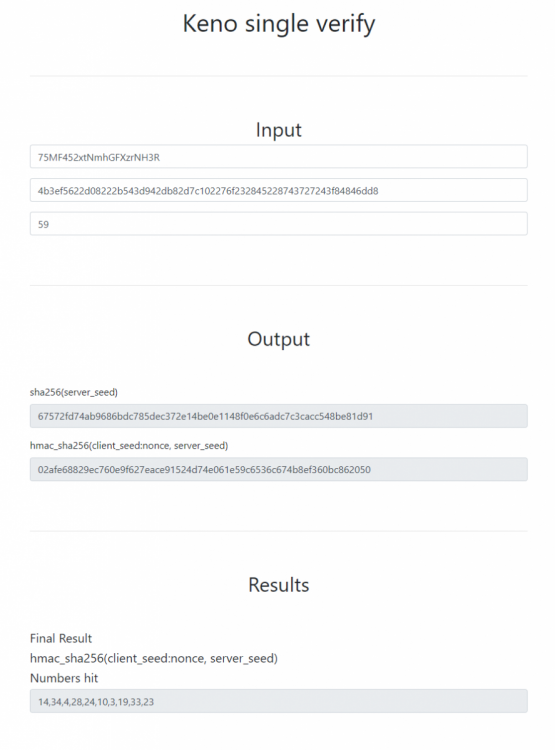 20. I'm not a big fan of adding graphics and stuff, just plain letters and numbers to check if its legit. I just used and combined code I found on github and bc.game to make it work. Its quite basic and no graphics, but easy to use for players. It is to verify the kenonumbers on kenosingle: https://trusting-leavitt-f9731d.netlify.app/keno single verify download: https://ufile.io/pbposcni